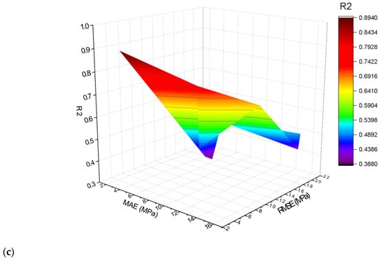 Flexural strength statistical representation: (a) MLPNN; (b) MLPNN-AdaBoost; (c) MLPNN-Bagging.