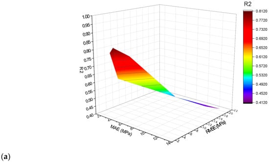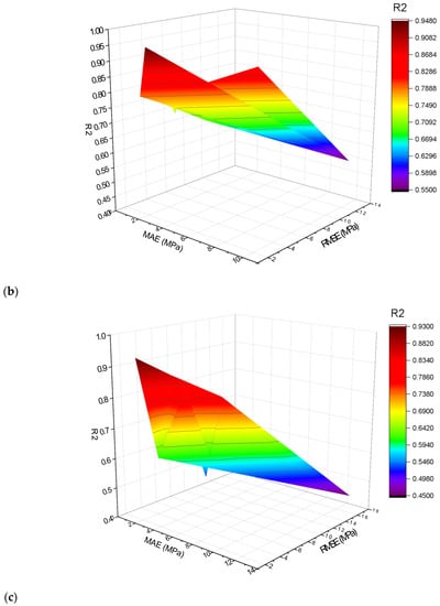 The k-fold technique was adopted for cross-validation in order to assess the performance of model while implementation. The performance of a model is determined by employment of statistical checks [67,68,69,70]. Normally, in the said k-fold process, there is splitting data in 10 clusters for random spreading by repeating this process 10 times for attaining suitable results. Table 3 provides the employed statistical checks. The compressive strength R2 values for MLPNN, MLPNN-Bagging, and MLPNN-AdaBoost models were 0.79, 0.89, and 0.95, respectively, as presented in Figure 16a–c. In the case of flexural strength, the R2 values for MLPNN, MLPNN-Bagging, and MLPNN-AdaBoost model were 0.81, 0.92, and 0.94, respectively, as presented in Figure 17a–c. It is observed that the R2 for MLPNN-AdaBoost is higher than those of the other considered algorithms, having lower error values for the SFRC compressive and flexural strengths.