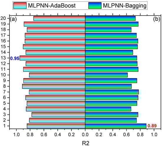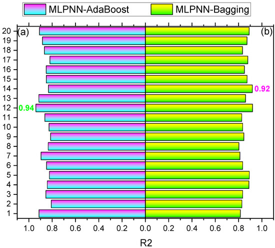 Flexural strength sub-models results: (a) MLPNN-AdaBoost; (b) MLPNN-Bagging.