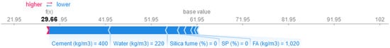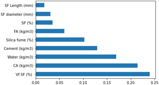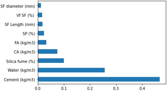 A thorough explanation is also given in the current research of the ML algorithm and interactions of considered input features. Different feature importance correlation for compressive strength of SFRC is shown in Figure 20. It can be observed that the feature value of cement feature is highest, i.e., 0.46, for SFRC compressive strength estimation. The cement feature has a positive influence, which means that by enhancing the cement content, the SFRC compressive strength increases. The SHAP plot (Figure 21) also shows that cement has the highest impact on SFRC compressive strength. The water feature has the second highest feature value of 0.26 for SFRC compressive strength; however, it influences negatively. Increasing the amount of water will reduce the compressive strength (Figure 21). Thirdly, the main factor for SFRC is silica fume, and this feature has approximately 0.1 feature value (Figure 20 and Figure 21). Further, the content of silica fume as a feature is positively influencing the SFRC compressive strength. It means that enhancement in its content turns into more compressive strength of SFRC. Coarse aggregate is next in line with a feature value of almost 0.8, but, in this case, the increase in coarse aggregate content up to optimum content only results in enhanced compressive strength. Beyond this optimum content of coarse aggregates, the SFRC compressive strength decreases. This behavior shows coarse aggregates’ positive and negative influence on SFRC compressive strength. Similarly, the feature value for sand, super-plasticizer is next, followed by steel fiber length, volume and diameter. All these considered features have more or less the same feature values near zero, showing their minimal impact on compressive strength of SFRC.