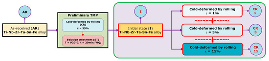 Figure 1 showcases the utilized thermomechanical processing route (TMP), beginning with the as-received (AR) TNZTSF alloy. To begin with, the alloy was cold-deformed by rolling (CR), using a Mario di Maio LQR120AS (Mario di Maio Inc., Milano, Italy) rolling-mill, with a total deformation degree (reduction in thickness) of approx. ε ≈ 35%, in three equal steps. After CR, as a second step, the TNZTSF samples were subjected to a solution treatment at 920 °C (ST) for a total time of 20 min. The solution treatment was followed by water quenching (WQ). The ST treatment was realized using a CARBOLITE-GERO SR 100 × 500 (Carbolite-Gero Inc., Neuhausen, Germany) furnace in high-vacuum conditions. The purpose of the preliminary TMP was to induce the formation of a pristine microstructure, consisting of a homogeneous equiaxed β-Ti phase, with an average grain-size in the range of 60–80 μm, and low remanent strain-stress fields. The resulted microstructural state counted as the initial (I) state for the final cold deformation, which was performed in one step, with a total deformation degree of ε ≈ 1% (CR 1), ε ≈ 3% (CR 3), and ε ≈ 15% (CR 15). The I, CR 1, CR 3, and CR 15 states were further microstructurally investigated.
