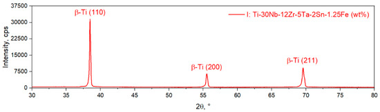 A typical XRD spectra of the TNZTSF alloy in its initial (I) state is showcased in Figure 3. The X-ray diffraction spectra confirmed that the alloy’s microstructure is composed solely of the β-Ti phase with its characteristic peaks being observed at 2θ = 38.65°, 55.81°, and 69.95°, corresponding to the (110), (200), and (211) reflection planes. The β-Ti phase was indexed in the 229 BCC system. The calculated lattice parameter was a = 3.293Å. No other secondary phases were detected.