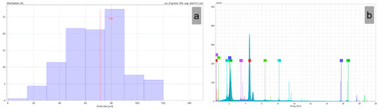 Grain-size distribution (a) and EDS spectra of the TNZTSF alloy in its initial (I) state (b).