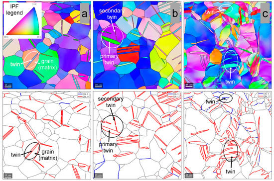 Figure 7 shows the IPF-Z and grain boundary distribution within the microstructure of the cold-deformed (CR) TNZTSF alloy by a total deformation degree (thickness reduction) of 1% (Figure 7a), 3% (Figure 7b), and 15% (Figure 7c). As observed, the CR processing with a 1% deformation degree leads to primary twins’ development in favorably oriented β-Ti phase grains, the observed twins showing lenticular morphology with the lenticule length along the twinning direction and lenticule thickness within the twinning plane (Figure 7a). Moreover, one can observe that the developed twins are characterized by a Σ11 CSL boundary orientation relation, indicating that the developed twins belongs to the {332}<113> twinning system. When increasing the applied deformation degree to 3%, besides the primary twins, one can observe the development of twins with different orientations within the same parent grain, indicating the activation of secondary twinning variants of the same {332}<113> twinning system (Figure 7b). A different twinning system was activated starting with the CR processing at a 15% deformation degree when, besides the {332}<113> twinning system, the first signs of the {112}<111> twinning system were also observed due to the appearance of Σ3 CSL boundaries within the deformed β-Ti phase grains (Figure 7c).