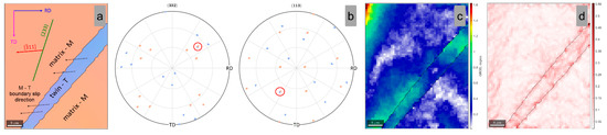 As shown in Table 2, the highest negative SF variant is represented by the ()[] twin variant, which shows a value close to SF = −0.487. The spatial orientation of the active ()[] twin variant is presented in Figure 8a, in which one can observe that the twinning [] shear direction nicely aligns with the matrix-twin boundary slip direction.