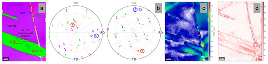 Figure 8a shows a high-magnification image of the indicated matrix-twin relation from Figure 7a, showing the orientation of the developed {332}<113> twin. In order to confirm the {332}<113> twin, the pole figures (PF) of <332> and <113> crystal directions were analyzed (Figure 8b). One can observe that one common <332> and <113> crystallographic axis for the twinned and the matrix grain region was observed, confirming that the observed twin belongs to the {332}<113> twinning system. The GROD distribution map of the twinned and the matrix grain region (Figure 8c) shows that the twinned area is a more stressed area in comparison with the adjacent matrix (max. GROD close to 1.6°). Moreover, KAM analysis shows that the twinned area is accommodating the strain field, by local dislocation structures, induced during cold deformation (Figure 8d) (max. KAM close to 0.56°).