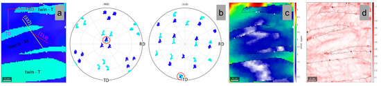 IPF-Z map (a); (332) and (113) Pole Figures (b); GROD map (c); KAM map (d) of the analyzed matrix-twin relation for the 1% cold-deformed by rolling TNZTSF alloy (CR 1).