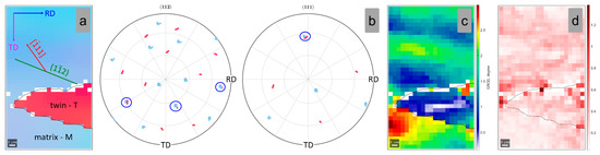 IPF-Z map (a); (112) and (111) Pole Figures (b); GROD map (c); KAM map (d) of the analyzed matrix-twin relation for the 15% cold-deformed by rolling TNZTSF alloy (CR 15).