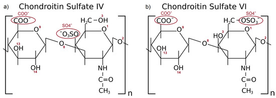 CS stands as a pivotal component of synovial fluid. It is a highly negatively charged unbranched glycosaminoglycan (GAG) compound of N-acetylgalactosamine and glucuronic acid [26]. Two variants of CS are found in human joints: chondroitin sulfate IV and VI (denoted as CS-4 and CS-6, respectively). The difference between both CS types is presented in Figure 1.