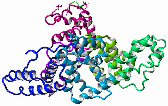 Ribbon representation of albumin in YASARA. Albumin domains are colored as follows: IA-pink, IB-violet, IIA-light green, IIB-green, IIIA-light blue, and IIIB-blue.