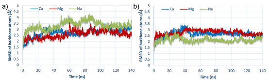 After MD simulations, the energy of binding for HSA:CS-4 is definitely of lower value than for HSA:CS-6; thus, the binding is more stable for the HSA:CS-4 complexes. Computation of averages for all the energy values over HSA:CS-6 and HSA:CS-4 provides the information that, after MD, complex HSA:CS-4 is about 15% stronger bound than HSA:CS-6, thus the situation is opposite than before MD simulations (cf. Table S1 and S2 in the Supplementary Materials). In about half of the cases (six for CS-6 and four for CS-4), adding CaCl into the solution caused the most stable complexes. For 3 out of 10 CS-6 complexes, the highest affinity of CS to HSA was observed in the presence of Mg ions and only 1 in the presence of Na ions. In the CS-4 isomer, the energy of binding was the lowest in three complexes for Mg ions and in three complexes for Na ions. However, complexes with the addition of NaCl usually created weaker bound systems than CaCl and MgCl. It was also confirmed by RMSF analysis (cf. Figure 4).
