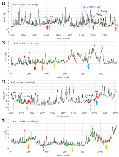 In the figure, four of the strongest bound places are marked by arrows. The colors of the arrows show which atom from HSA has bound to the atom coming from CS. In the HSA:CS-6 complex, Pro (carbon atom) made HP interactions with the carbon atom of CS (blue arrow). A single carbon atom from CS (red arrow) created a few HP interactions with HSA bounding two different regions of HSA with CS. Carbon atoms from Glu and Asp created Ca bridges with carbon atoms of CS (yellow and orange arrows). The existence of HP and HBo interactions of CS with Lys475 (marked with red letters) which is indicated as the binding site of long-chain fatty acids can be very important [37]. In HSA:CS-4, Lys had a few interactions with the carbon atom of CS (blue arrow). Glu ionic bridged with carbon atoms of CS (orange and yellow arrows; C-Ca-C bridges). Aps ionic bridged with the oxygen atom of CS (green arrow, C-Ca-O bridge). Usually, binding places from CS have lower values of RMSF, but in the case of HSA, it was not a rule. Thus, a stabilizing effect of CS on HSA cannot be reported. Note that in Figure 4, HP interactions, HBo, and ionic bridges are shown, but water bridges have been omitted due to their very short duration. At almost every MD step, other atoms took part in creating these bridges. In Figure S6 of the Supplementary Materials, the RMSF for the IIIA domain for the HSA:CS-4 complex is shown to compare the same fragments between the two best-bound complexes. It can be seen that different parts of HSA interacted with CS-4 in a different place than with CS-6, and mainly the interaction was with Lys and Glu. In general, RMSF values were lower for CS-4 for both HSA and CS molecules.