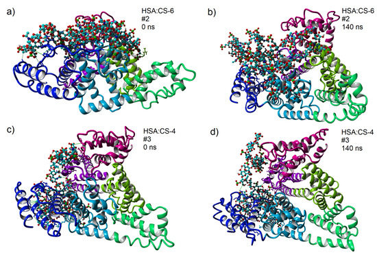 Snapshots of the HSA:CS-6 and HSA:CS-4 complexes in CaCl solution before and after 140 ns of MD simulation for best-bound complexes (#2 for HSA:CS-6 and #3 for HSA:CS-4) are presented in Figure 5. Similar Figures for MgCl and NaCl solutions are presented in Figures S9 and S10 of the Supplementary Materials.