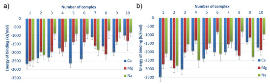 An important observation should be made for CS-6 complex #1, in which every direct intermolecular interaction type (HBo, HP, ionic) has a greater number of interactions in the case of Na than Ca and Mg. It also has slightly more water bridges, but at the same time, it has a much smaller number of ionic bridges. Taking into account that the energy of binding for Na is greater than for Ca and Mg and that the complex is weaker bound for Na than for Ca and Mg, it can be stated that the ionic bridges are of great importance for the stability of HSA:CS-6 complexes. The visible difference in the effect of Ca and Mg for ionic bridge formation is suggested to be due to the lower hydration of Ca [12]. The influence of Ca and Mg on albumin binding can be explained by the fact that albumin interacts with it. HSA has almost no interaction with Na ions [64].