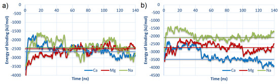 The charts were plotted for best-bound cases (#2 for HSA:CS-6 and #3 for HSA:CS-4). The vertical lines show values averaged from 40 ns to 140 ns (thus, after stabilization of structures in MD). In both cases, structures with the addition of Ca to the solution are bound stronger than in the rest of the cases. It is very interesting that for HSA:CS-6, all averaged energies were similar. The trend is only seen for HSA:CS-4 and accords with the expectation which considers the cavity’s role in the electrostatic potential map of the HSA (described earlier in Section 3) and cations bridges formation in the macromolecules binding. This confirms the prominent role of Ca in the binding.