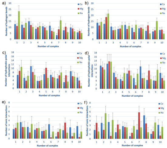 The main observation from Figure 8 is that the charts are not much different. It can be seen that the number of HBo is slightly greater for complexes characterized by lower energy of binding, thus a stronger bound. The same can be seen for HP interactions in HSA:CS-4 but not in HSA:CS-6. In general, HSA:CS-4 has created more HBo and HP interactions. It also has a more varied plot of ionic interactions than HSA:CS-6. The number of ionic interactions is the lowest among the others. However, thanks to their electrostatic origin (the electrostatic force of attraction governs them), they are the strongest, so they are also important. HP interactions are also usually stronger than HBo. Thus, it is hard to determine which of the three non-covalent interactions influences most of the HSA:CS binding. An additional important observation is that the number of ionic interactions in most complexes is greater for the NaCl solution (cf., Figure 8e,f). Analyzing the influence of the ions added to the solution, the most visible is the prevalence of the number of HBo in the case of best-bound complexes in NaCl solution. This can be caused by Na having the lowest ionic strength among the three ionic solutions (NaCl, CaCl, and MgCl). As a result, it does not have such strong adsorption properties on the surface. As a result, the HBo are formed more often in NaCl than in ionic interactions or ion bridges preferentially formed in divalent ion solutions.