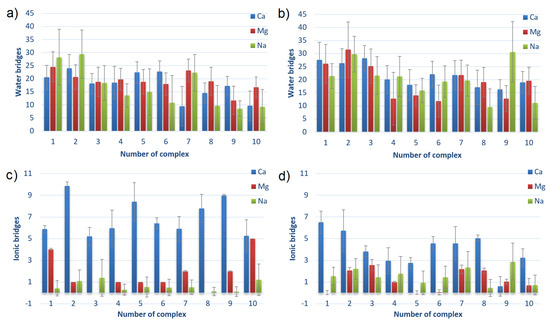 The number of hydrogen bonds mediated by water molecules (water bridges) and the number of ionic interactions mediated by cations (ionic bridges) between HSA and CS-6 (a,c) and between HSA and CS-4 (b,d). The complexes are sorted from lowest to highest averaged energy of binding after MD simulations; thus, the first is the strongest bound (cf., Table 1). Error bars present doubled STD.