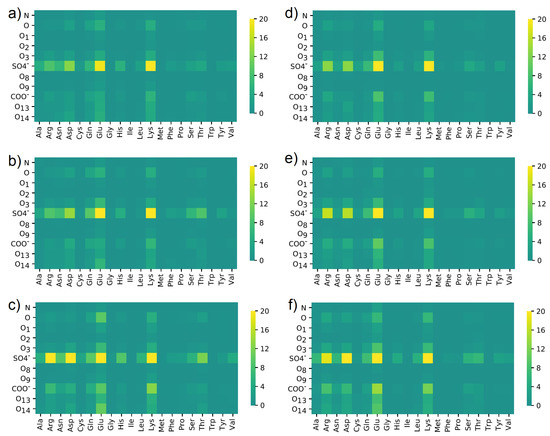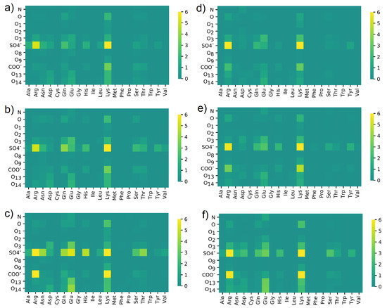 Water bridges distribution between different oxygen classes in (a–c) CS-6 and ((d–f) CS-4 and different amino acids in HSA. Data were obtained in solutions containing: (a,d) NaCl; (b,e) CaCl; (c,f) MgCl. The maps present a number of interactions. The denotation of the atoms and functional groups is presented in Figure 1.