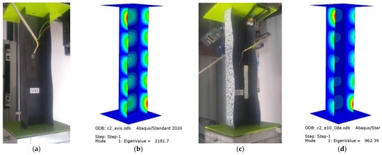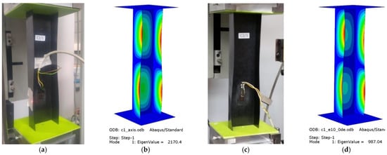 The FEM model attempted to represent the actual support of the column at both ends of the testing machine (Figure 5a). Reference points corresponding to the position of the centers of gravity of the ball joints of the mounting heads were used, where simple support boundary conditions were defined. Two translational degrees of freedom (Ux = Uy = 0) and rotation relative to the axis of the column (URz = 0) were constrained at the point reproducing the upper ball-and-socket joint, whereas three translational degrees of freedom (Ux = Uy = Uz = 0) and rotation (URz = 0) were constrained at the reference point for the lower ball-and-socket joint. The reference points were linked with the rigid plates supporting the columns ends, by coupling all degrees of freedom of the points and the plates. The column was loaded with a compressive force concentrated at the upper reference point. A given value of the eccentricity parameter “e” was applied by changing the position of the column model relative to the rigid plates and displacing it perpendicular to the web (Figure 1b) by a value of 10 mm, and then rotating it with a fixed value every 15°. Contact relations were defined between the column ends and the plates. The structure of the laminate structure was modelled using the layup–ply technique, which made it possible to reproduce the layup of the composite material and ensure a uniform thickness of the finite elements by defining the ply thickness, material type, and fiber orientation (C1—Figure 5b, C2—Figure 5c).