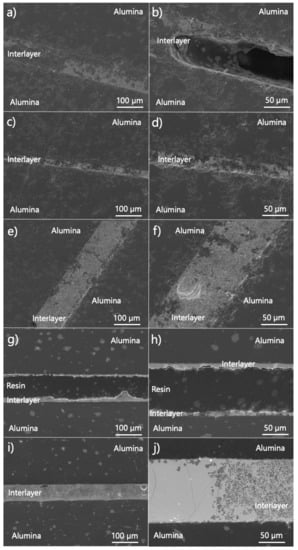 The cross-section analysis of samples with 5, 10, 15, 20 and 25% weight of zinc oxide was performed by using SEM. The obtained results are presented in Figure 2. As it can be seen, the interlayers with 10, 15 and 25% weight of ZnO have the best quality among the presented figures (Figure 2c–f,i,j). They are uniform and there are no visible holes in the Bi2O3-ZnO phase. For the composition with 25% weight amount of ZnO (Figure 2j), cracks through the interlayer are noticeable. In the rest of the cross-sections, where the interlayers contain 5 and 20% weight of ZnO, gaps can be noticed (Figure 2a,b,g,h). The lowest integrity of the joint can be assigned to the mixture with 20% weight of ZnO (Figure 2g,h). The system has a lot of free spaces between alumina discs, which were filled with resin during the sample preparation. The interlayer with 5% of ZnO (Figure 2a,b) can be characterized by the appearance of several gaps at different places along the joint. Based on the integrity of the obtained joints, compositions with 5 and 20% weight of ZnO were excluded from the further examinations.