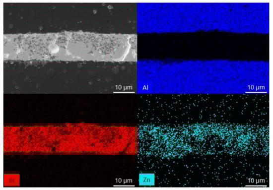 EDX analyses of sample cross-sections with a ZnO weight of 10, 15 and 25% were performed to examine the diffusion mechanism occurring during the bonding (Figure 3, Figure 4 and Figure 5). In each image, two phases can be distinguished in the interlayer: a matrix with a lighter color and a precipitate marked with a darker color. The results show that Zn is the component that is mainly present in the precipitate and Bi is not. It can also be seen that Zn is the component which moved from the interlayer to the ceramic. It seems that the migration of Bi and Al atoms is not evident.