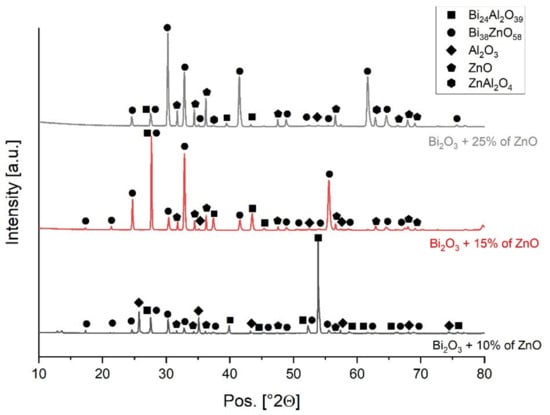 The ceramic surfaces coated with the interlayer and sintered at 750 °C were examined by XRD as well to investigate further the bonding reactions that occur. The peaks were matched to phases using the Highscore plus software (Figure 7). The XRD spectra of Bi38ZnO58 and Bi24Al2O39 are very similar, with differences mostly in peak intensities at the 2θ values. As a result, some of the peaks were assigned to both phases. In the samples with more ZnO (i.e., samples with 15% and 25% ZnO), the Bi38ZnO58 peak had the highest intensity. Meanwhile, in the sample with only 10% ZnO, the peak assigned to the Bi24Al2O39 phase had the highest intensity. The XRD pattern also detects the presence of alumina and ZnO. ZnAl2O4 seems to be scarcely present; however, the presence of this phase might be masked by the predominant peak intensities associated with the Bi38ZnO58/Bi24Al2O39 phases. Moreover, these spectra were acquired on the surface of the applied interlayer, which was not in contact with alumina. Therefore, it is possible that there was less interaction between the alumina and the part of the interlayer that was analyzed by XRD and Raman. The chemical compositions of the three interlayers after thermal treatment are quite similar to each other. Besides the detected starting materials ZnO, Bi2O3 and Al2O3, the results show the presence of Bi38ZnO58 and Bi24Al2O39. Nevertheless, it is interesting to note that different concentrations of ZnO result in differences in the relative peak intensities of the three interlayers. The spectrum of ceramic coated with Bi2O3 and 25% weight of ZnO has peaks that can be assigned to ZnAl2O4.