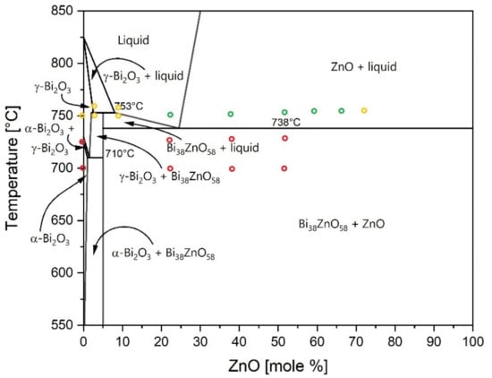 Phase diagram of Bi2O3-ZnO system; the circles in the phase diagram indicate the tested interlayer compositions and joining temperatures. Red circles indicate no bonding, yellow circles indicate weak bonding and green circles indicate strong bonding (Reprinted/adapted with permission from Ref. [36]. 2004, Springer Nature).