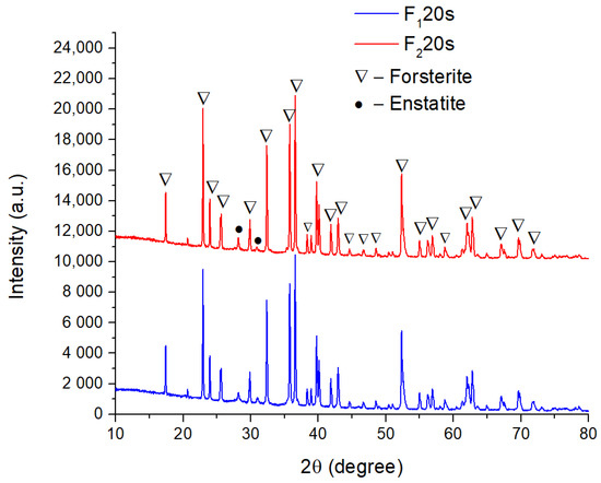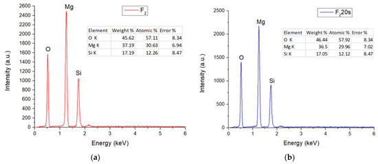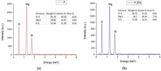 Figure 4 exhibits the EDS (X-ray energy dispersion) spectra of the F1 and F120s samples. It can be seen that, in both cases, the specific elements of forsterite (Mg, Si, O) were identified, once again confirming that the elements present in the porogenic agent did not remain in the sample composition, influencing only its porosity.