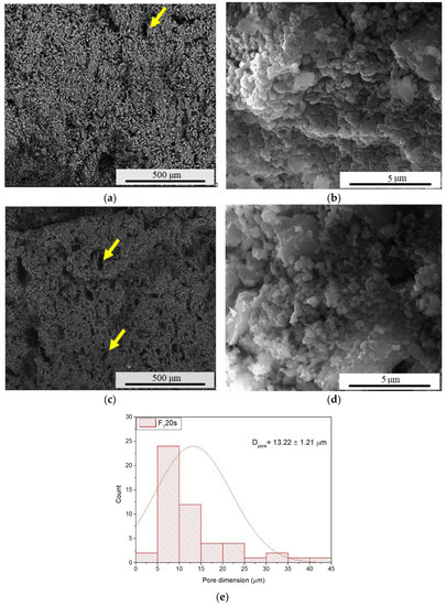 SEM images magnification ×200 and ×20,000 of F1 (a,b) and F120s (c,d) samples and pore dimension distribution (e); the pores are indicated with yellow arrows.