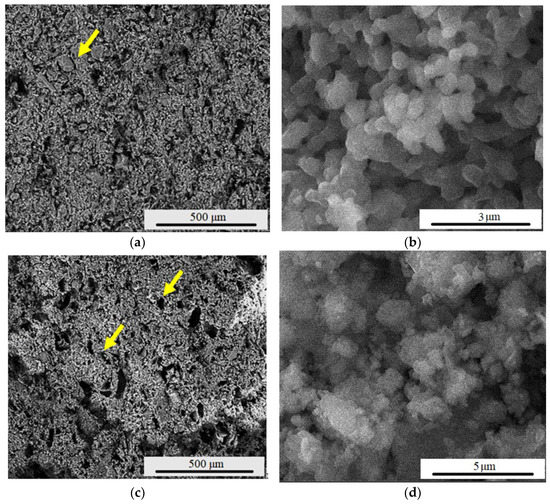 Figure 5 presents the influence of the sintering temperature on the microstructure of the samples, evaluated by SEM. Thus, Figure 5a,b presents the surface morphology of the F2 sample, having mostly spherical particles, as well as pores. The average particle size, in this case, is around 300 nm (increase most likely due to particle agglutination). Regarding the F220s sample (Figure 5c,d), in which a porogenic agent was introduced before the sintering process, a higher number of pores with average dimensions of 39.72 μm are present in the sample structure (see yellow arrow).