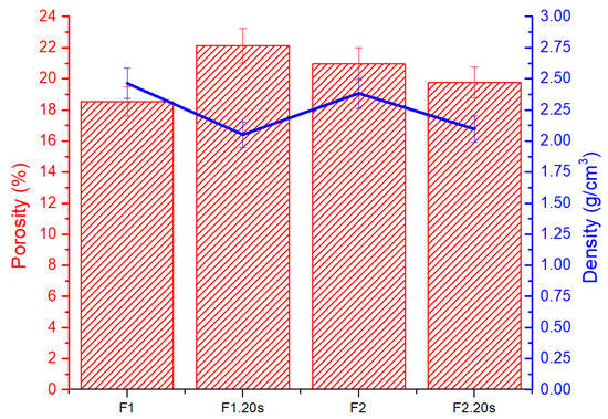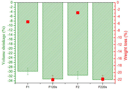 Figure 8 shows the shrinkage and weight loss of forsterite samples as a function of working temperatures. It is obvious that in the case of samples F120s and F220s, the combustion contraction (33.23 and 33.49%, respectively) was superior to samples F1 and F2 (29.88 and 31.58%, respectively) with the exposure to heat treatments. Additionally, the weight loss is more pronounced in the case of samples in which the porogenic agent was introduced. The explanation for these behaviours is found in the fact that sucrose was removed through the heat treatments to which the samples were subjected.