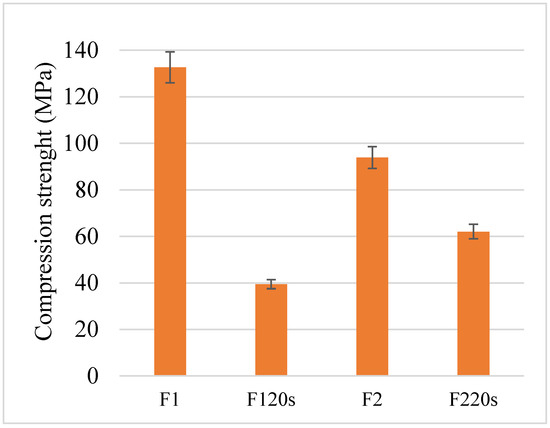 The samples’ compressive strength is presented in Figure 9. It can be seen that the F120s sample, which showed the highest porosity, is also the most prone to compressive load failure, becoming deformed at 40 MPa. This confirms the already known results in the literature according to which the material resistances are affected by the increase in its porosity. In the case of forsterite, the temperature negatively influenced the compressive strength. Thus, the F2 sample, which was treated at a temperature of 1320 °C, showed a lower compressive strength of 94 MPa than the F1 sample treated at a lower temperature. The most resistant sample after the tests was F1, with a very good resistance of around 132 MPa. This falls within the range of compressive strengths of cortical bone tissue, far exceeding the resistance of the trabecular bone [42] and being another favourable point in terms of optimal treatment temperature of forsterite between 1200 and 1300 °C. F220s withstood a pressure up to 62 MPa.