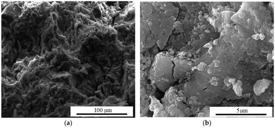 Figure 10 shows the SEM analysis of F1 and F120s samples after immersion in SBF. The obvious decrease in pore size suggests that the HAp layer managed to grow inside them, thus mineralizing the surface. In Figure 10b,d, it can be seen how the samples’ surface tends to become more compact, which may be explained by the development of HAp aggregates. This can be seen both at magnifications of ×1000 (100 µm) and when the magnifications are increased to ×20,000 (5 µm).