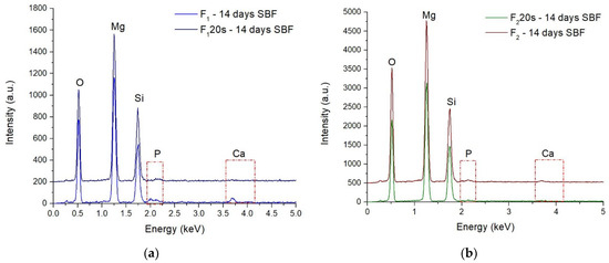 EDS spectra for F1, F120s samples (a) and F2, F220s samples (b) after 14 days in SBF.