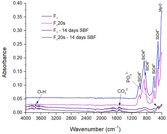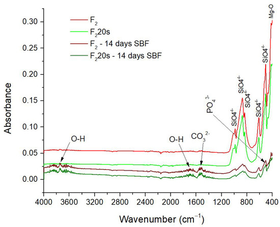 FTIR Spectra of F2, F220s before and after 14 days in SBF.