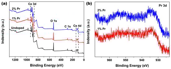 In order to probe the surface chemical compositions and their oxidation states that might have occurred in the Pr-doping CeO2 systems, XPS analysis was employed to study the Undoped and Pr-doped CeO2 samples. Figure 2a shows the wide-scan spectra of Undoped, 1% and 2% Pr-doped CeO2. As observed, all of these wide-scan spectra were dominated by the signals of Ce3d, Ce4d, O1s and C1s, and their profiles were similar to that obtained in the previous studies for CeO2 [36]. Moreover, the corresponding Pr3d XPS regions of 1% and 2% Pr-doped CeO2 were recorded and are shown in Figure 2b. The characteristic peaks of Pr3d XPS regions implied that Pr were in +3 states, indicating that the Pr element had been successfully incorporated into the CeO2 lattice with normal trivalence states [37,38,39,40].