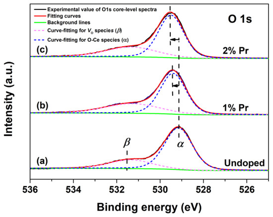 To investigate the changes of chemical states of oxygen in CeO2 with Pr doping, the O1s XPS regions and respective fitting curves of Undoped, 1% and 2% Pr-doped CeO2 were recorded, and the results are shown in Figure 4. The O1s XPS spectra of Undoped CeO2 could be curve-fitted into two peaks, indicative of the presence of two kinds of oxygen species on the CeO2 surface. The peak at about 529.1 eV (labeled as α) could be assigned to the lattice oxygen of O-Ce species, whereas that of about 531.5 eV (labeled as β) could be assigned to the chemisorbed oxygen species or/and weekly bonded oxygen species related to the oxygen vacancies (labeled as VO). The β peak that appeared in Undoped CeO2 indicated that pure CeO2 itself possessed a certain number of VO defects. Considering the traces of the Pr element in doping CeO2, the O1s XPS spectra of 1% and 2% Pr-doped CeO2 were also curve-fitted into two peaks. Compared to the binding energy of the O1s spectrum in Undoped CeO2, there was a blue shift of 0.3 eV for 1% Pr-doped CeO2 and 0.4 eV for 2% Pr-doped CeO2, respectively. The blue shift of O1s peaks suggested the reduction of the valence state of lattice oxidation from O-Ce species; in other words, Pr-doping benefited the VO species in creation. The rising numbers of VO species in CeO2 could be attributed to the incorporation of Pr3+ into the CeO2 lattice to form solid solutions. The substitution reaction of Ce4+ cation by Pr3+ cation could be written in Kroger and Vink notations, as expressed by Equation (2):