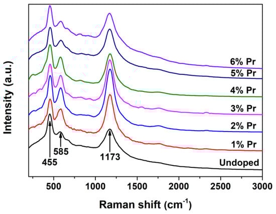 Laser Raman is rather powerful in identifying the nature of surface VO defects because of its sensitivity to crystalline symmetry [43]. The Raman spectra for Undoped and Pr-doped CeO2 are shown in Figure 5. As observed, the undoped CeO2 showed an obvious band at 455 cm-1, which can be assigned to the F2g vibration mode of the O atoms around Ce4+ cations, and the band at 1173 cm-1 can be attributed to the second-order transverse acoustic mode of CeO2 fluorite structure, whereas the weak band at 585 cm-1 has been proven to be associated to the VO defects and has been widely observed in substoichiometric CeO2-x [44]. The presence of the weak band at 585 cm-1 suggested that there existed a certain amount of VO defects in pure CeO2. Moreover, the Pr-doped CeO2 exhibited a stronger 585 cm-1 peak than the undoped one; the intensity of the band at 585 cm-1 initially increased and then decreased with the increasing Pr-doping amount. As an alternative approach to estimate the concentration of VO defects in CeO2, the intensity ratio of the bands at 585 and 455 cm-1 (I585/I455, labeled as [VO]Raman) was calculated, and the results are shown in Table 1. The relative [VO]Raman, which is the value of I585/I455, reached a maximum in 1% Pr-doped CeO2, then decreased.
