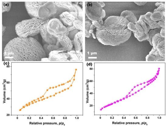 To clarify the effects of Pr-doping on the morphology of CeO2, SEM analysis was conducted. Figure 6a,b show the SEM images of Undoped and 6% Pr-doped CeO2 particles. As observed, both the morphologies of Undoped and Pr-doped CeO2 particles were the multilayered structure consisting of nanoflakes that intercalated, forming an open, porous structure. To further clarify the porous nature of CeO2 samples, N2 adsorption–desorption experiments were conducted, and their BET specific surface areas were determined using the Brunauer–Emmett–Teller method. Figure 6c,d show the N2 adsorption–desorption isotherms of Undoped and 6% Pr-doped CeO2, respectively. The hysteresis loops in the relative pressure (p/p0) range of 0.4–1.0 were observed, consistent with type IV hysteresis loops, confirming their mesoporous structure [45]. Moreover, the BET specific surface area of Undoped CeO2 was 96.0 m2/g, slightly higher than that of 6% Pr-doped CeO2 (85.8 m2/g). Compared to Undoped CeO2, the morphology of 6% Pr-doped CeO2 still maintained the original multilayered structure, implying that the incorporation of Pr cations into the CeO2 lattice had little impact on their morphology; however, Pr-doping could affect their specific surface areas.