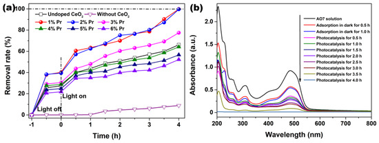 The adsorption in dark and photocatalytic degradation of AO7 solutions by Pr-doped CeO2 were measured and compared with that of Undoped CeO2. Figure 8a shows the removal rates of AO7 in the presence of Undoped and Pr-doped CeO2. In order to make sure of the important role of CeO2 and Pr-doped CeO2, a blank experiment (self-photosensitized process) was also performed under identical conditions. As observed in Figure 8a, the blank test confirmed that AO7 dye only slightly was degraded under ultraviolet light in the absence of CeO2 and Pr-doped CeO2, indicating that the photolysis could be ignored. Like the adsorption of AO7 in the dark, all CeO2 samples nearly reached an adsorption–desorption equilibrium within 30 min of reaction; however, only 1% and 2% Pr-doped CeO2 (37.9% and 38.2%) possessed the remarkable adsorption capability of AO7 compared to that of Undoped CeO2 (25.6%). After 4 h of reaction, the removal rates of AO7 by 1% and 2% Pr-doped CeO2 approached 100%, much higher than 66.2% for Undoped CeO2. From the analysis results of Raman spectra in Figure 5, Pr-doping with a 1–6% level could induce more VO defects than Undoped CeO2. The number of VO basically stayed the same with the doping concentration more than 3%, but their colors got darker and darker, which changed the absorption and utilization of light, supported by UV-VIS spectra in Figure 7. In addition, Pr-doping had different effects on the BET specific surface area and grain size of CeO2. Therefore, we could draw a conclusion that the factors affecting the photocatalytic efficiency of CeO2 for AO7 were not single, and it was believed that the changes in the grain size [VO] and the optical properties caused by doping effects with Pr had affected the adsorption capability and photocatalytic activity of AO7.