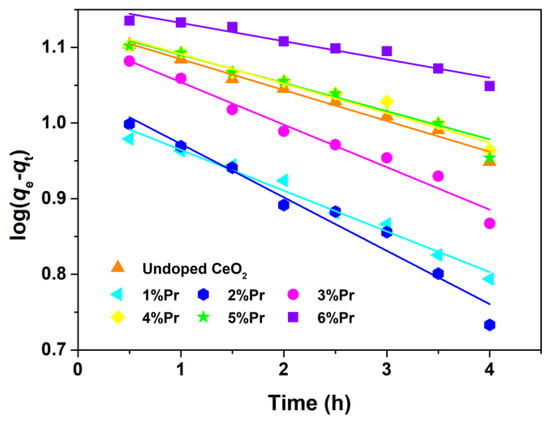where q (mg/g) is the adsorption amount for AO7 dye, k (1/h) is the apparent rate constant, C0 (mg/L) is the initial concentration at t = 0, Ce (mg/L) is the solution phase concentration of AO7, m (g) is the mass of CeO2 samples and V (L) is the volume of AO7 aqueous solution. The variations in log(qe-qt) as a function of illumination time are shown in Figure 9. The apparent rate constants (k) and relative coefficients (R2) obtained by fitting with the pseudo-first-order model are summarized in Table 2. It was found that the 2% Pr-doped CeO2 showed the highest degradation rate, and that was k of 2%; Pr-doped CeO2 was about 1.7 times higher than that of undoped CeO2. The enhancement of photocatalytic activity was attributed to the doping effect induced by Pr. In addition, the correlation coefficients (R2) of all samples are above 0.93, suggesting that the photocatalytic degradation process of the AO7 molecule tends to follow the pseudo-first-order kinetic model.