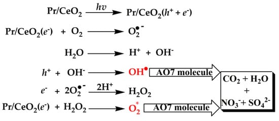 Figure 10 shows the proposed radical ion mechanism for AO7 degradation. Under the irradiation of ultraviolet light, electron (e-) was excited from the VB to CB of Pr-doped CeO2 catalyst (Pr/CeO2) and a charge vacancy in the hole (h+) in the valence band was also created. These photogenerated h+ and e- could react with the adsorbed water (H2O) and O2 on the surface of the Pr/CeO2 catalyst, the active oxidative ionic radicals (O2•-) and the hydroxyl radicals (OH•) generated in the reaction medium, which were very reactive and could quickly oxidize organic species on the Pr/CeO2 surface. Moreover, the generation of OH• radicals along with the formation of hydrogen peroxides (H2O2) increased the catalytic activity towards the degradation of AO7. Subsequently, the generated H2O2 reacted with Pr/CeO2(e-), leading to the formation of nascent oxygen (active oxygen, O2*), which happened with the reduction of Ce4+ to Ce3+ states. The tetravalent oxidation state of Ce could provide multiple photogenerated e- to vary the electrical conductivity and enhance the catalytic activity of Pr/CeO2. Furthermore, the Pr-doping could induce the formation of VO defects in the CeO2 crystal, which could enhance its capacity to capture oxygen from the environment, and these stored oxygen species could be released quickly to the reaction medium, and then more highly reactive O2* species were produced, leading to the degradation of AO7 dye under the irradiation of ultraviolet light. Finaly, there was the degradation of the enlisted organics to CO2, H2O and other less toxic minerals such as nitrates and sulphates [58]. From the above description, the formation of the photogenerated h+ and e- was the beginning of the catalytic reaction. If the CeO2 catalyst surface was completely covered by AO7 molecules, the generation of h+ and e- would be seriously affected because of the blocked contact between ultraviolet light and the CeO2 catalyst surface, and the catalytic efficiency of the catalyst would also decrease.