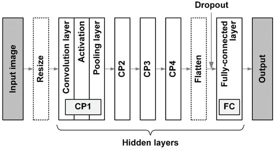The hidden layers consist of CP layers that combine convolution, activation functions, pooling operations, and a fully coupled layer (FC). The convolution layer in a CP layer has multiple channels, and image information is stored in each channel; the current and previous layers are connected by convolution with filters, which are small images. The shapes of the filter images are determined during the network training. The image size is reduced during the convolution process. Padding and stride are applied additionally to control the image reduction during the convolution operation. After the convolution operation, the data are connected to an activation function and a pooling operation that further reduces the image. For details on each operation, refer to references [24,25]. As shown in Figure 2, four CP layers were connected in the network. When an image is sufficiently reduced after passing through CP4, it undergoes a flattening process and is connected to the FC layer, which is a general artificial neural network. Between the flattened and FC layers, a 50% dropout was applied to minimize overfitting. Finally, the FC layer was connected to the output layer to yield the regressed result.