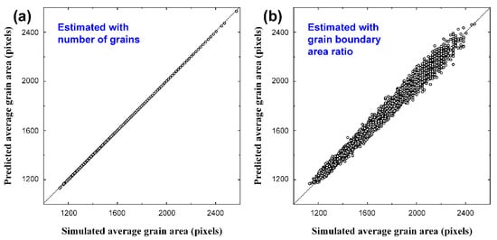 where ξ is the half width of the grain boundary. Based on Equation (2), the relationship between G and A was analyzed using 4000 images and is shown in Figure 3b. Although a significant error occurs compared with Figure 3a, which shows the result predicted by the number of grains, it is clear that the average grain size can be predicted by the ratio of the grain boundary areas.