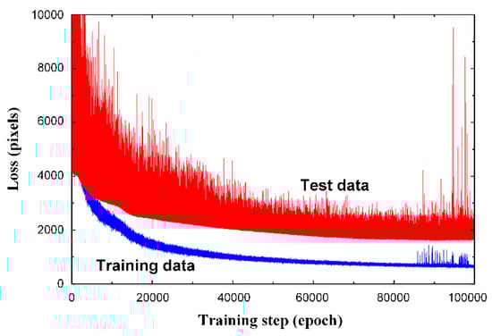 Graph of loss for training and test data during the network training. No overfitting was found up to 80,000 epochs, and high peaks of noise appeared after that. Therefore, the optimum training steps for CNN was determined as 80,000 epochs.