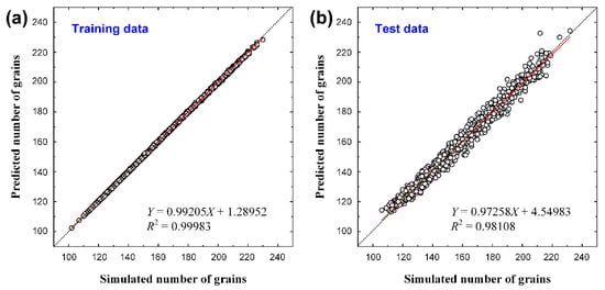 Comparison between the measured and predicted numbers of grains for (a) 3000 training data and (b) 1000 test data. X and Y axes represent measured and predicted values, respectively.