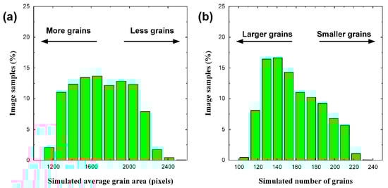 A basic analysis of the grain structure generated by the phase-field model is helpful in interpreting the results of machine learning in subsequent analysis. The average grain size can be measured in two ways using the computational simulation results shown in Figure 3a. The most intuitive and easiest way to determine the average grain size (A) is to divide the number of grains in the total image area (Atotal) by the number (n) of grains in the entire image: