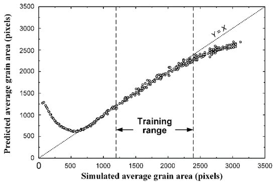 In the case of a range of approximately 600–1200 pixels, which is lower than the training range, the accuracy is also high. Below 600 pixels, the predicted grain areas deviate from the correct values. This is because many small grains of less than a few pixels are buried in the grain boundary area and are not properly identified, which is not a problem in machine learning. However, when the grain area was larger than 2400 pixels, the average grain size was underestimated compared with the actual value. This phenomenon occurs when the average grain size is large, even within the training range. This error is an extension of the underestimation within the training range. Considering these results, when satisfactory regression is achieved within the training range, the network function may be universally used not only for interpolation within the training range but also for extrapolation outside this range.