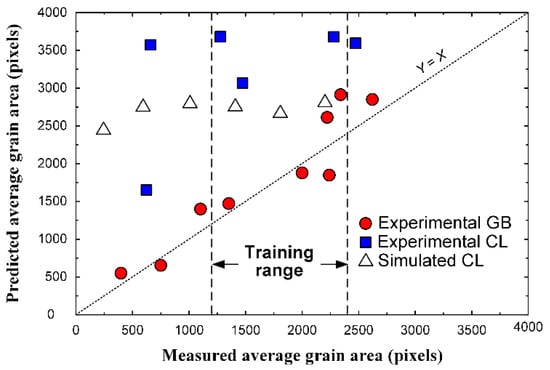 Comparison between the measured and predicted average grain area for datasets of experimental and simulated images.
