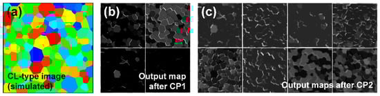 Figure 11 shows the mid-layer image analysis of a simulated CL-type image, which could not be used to accurately predict the average grain size with the CNN used in this study. When observing the images after CP1 or CP2, an effort was made to obtain the color information of the grains. In addition, an attempt to detect the components of the grain boundary was found, but it was unclear compared with the case of GB-type images. A CNN trained with images which clearly show grain boundaries, such as GB-type images, cannot recognize CL-type images in which grain boundaries are defined by color variations of grains.